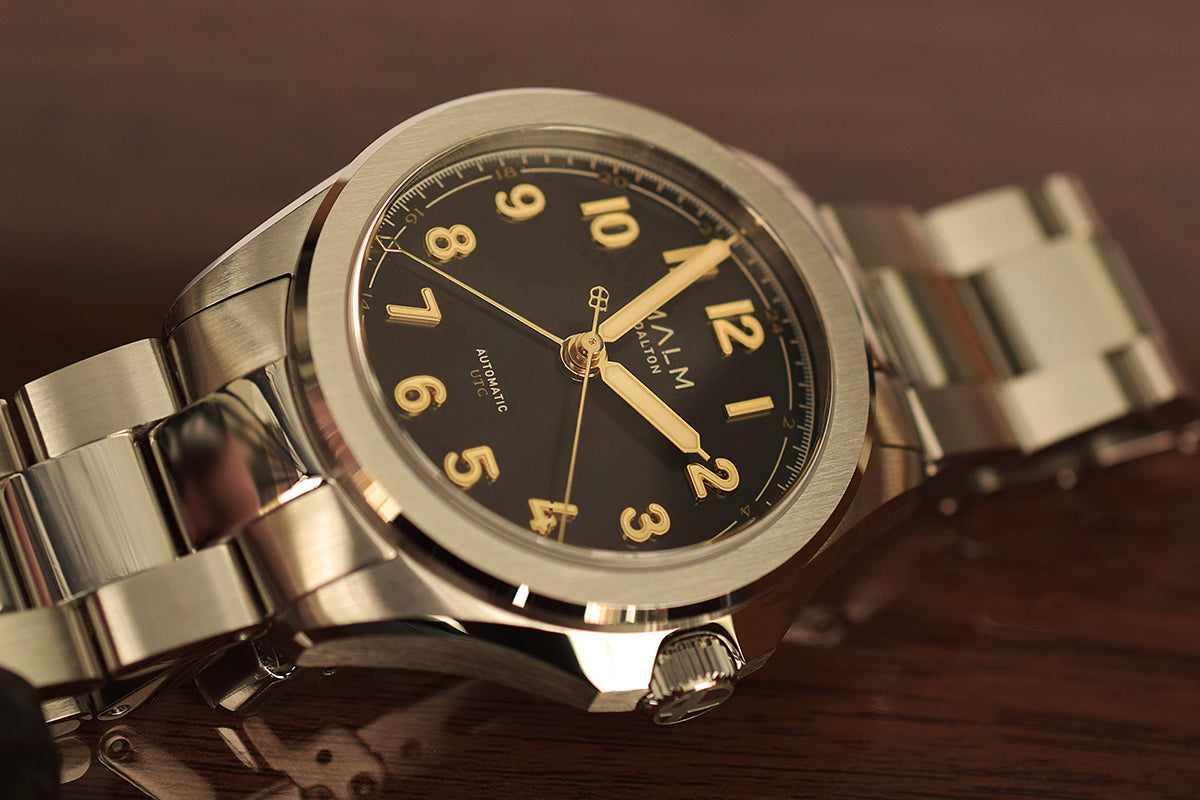 The Dalton UTC Automatic 38 is the reimagined development of the collection with a smaller diameter case and automatic movement with UTC complication. Yet it remains faithful to the original Dalton model from 2019, the very first watch ever released by MALM, and seamlessly combining the same design attributes of Swedish aviation history. The result is a modern watch with new functionalities and with a sophisticated design.