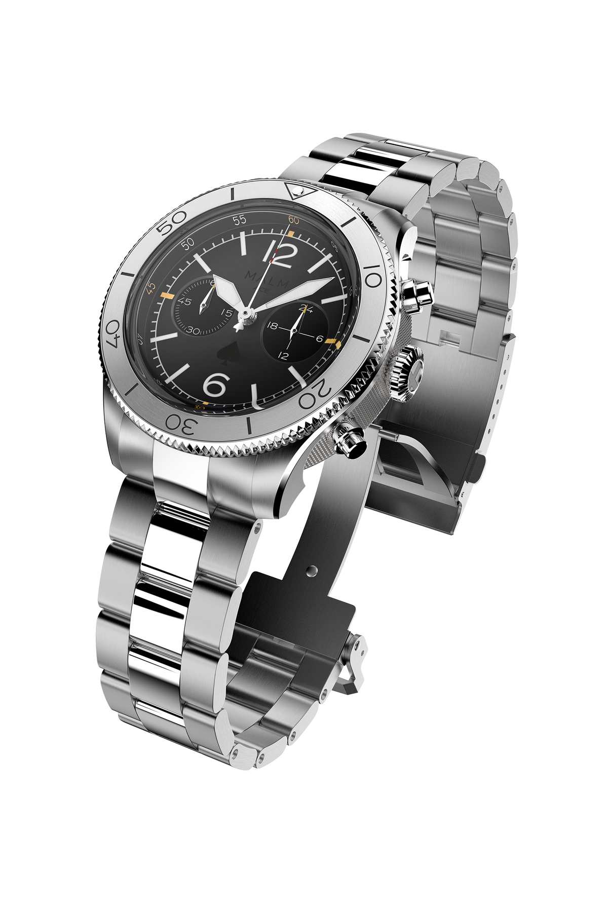 Functions: Right sub-dial shows the hours (24) of the day. Left sub-dial tracks elapsed minutes when chronograph is activated. Rotating bezel with lume dot at 12 o'clock marker